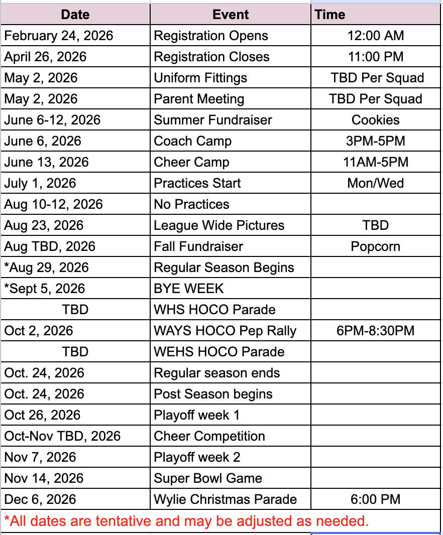 Welcome to the Wylie Cheer Registration. This registration is for the 2026 fall cheer season.