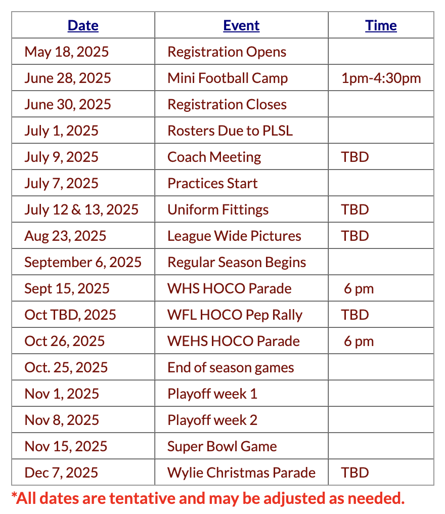 Since joining Premier Lakes, we are now a Wylie ISD-based league. What does that mean? The majority of the kids must be from Wylie, Sachse, or Murphy and/or go to a Wylie ISD school.